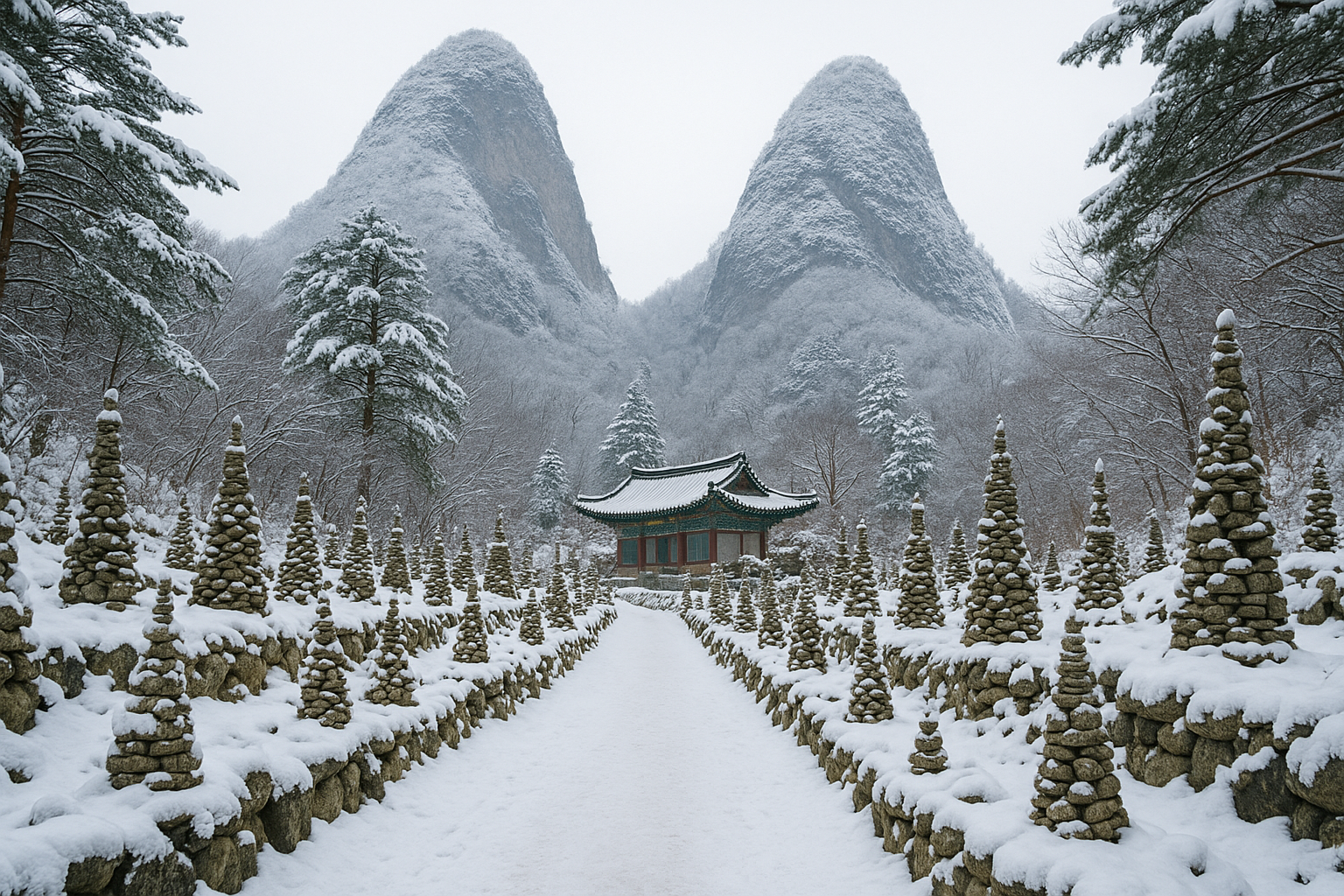 수백 개의 돌탑 위로 눈이 얹혀 있고,